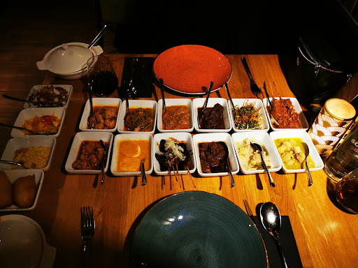 Het hoofdgerecht was qua smaak redelijk goed, maar vooral het vlees was behoorlijk droog. De saté van varkensvlees was goedkope gemarineerde speklap die taai en droog was. De klets pindasaus maakte het enigszins goed, maar je kunt ook een iets betere kwaliteit vlees gebruiken.