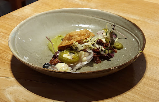 Gazpacho, lekker makkelijke amuse denk ik maar een amuse met flink rauwe ui en knoflook is niet heel handig. Steak tartaar vooraf, goed vlees, veel rauwe ui, beetje jammer. Hoofdgerecht. Vis is in nogal royaal olie gebakken maar wel goed gaar. Venkel rissotto, van mij mag de venkel wel wat gaarder. Hoofdgerechten hadden wel wat beter op smaak gemogen