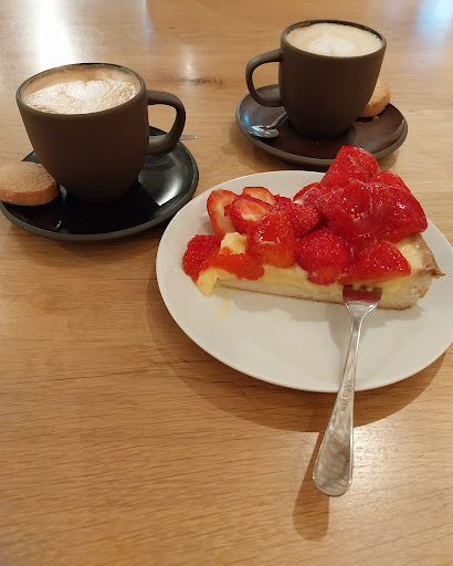 On our most recent trip, we enjoyed a flavorful cappuccino with a fresh slice of strawberry custard...