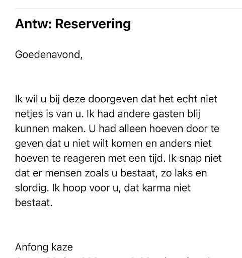 Het mag duidelijk zijn dat dit voor ons echt de allerlaatste keer is geweest. Als je het restaurant niet kunt runnen ivm. drukte bij de afhaal, kun je beter een afhaal restaurant beginnen. Moederdag drukte is geen excuus. Daar had je al ver van te voren op in...