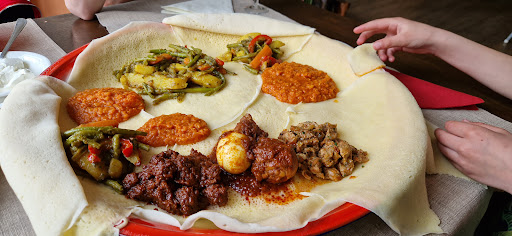 I've been coming here with friends for at least 15 years and it's always delicious. Very enjoyable and festive experience sharing a big platter. You get yoghurt for if you should need to tone down any of the spice levels and that combination is very good. Some of the dishes are a bit heavy on the chilli oil, which soaks into the injera underneath and makes them (for me) inedible spicy. The 'dressing' of the restaurant is basic, and the experience could be enhanced - small cloth towels instead of paper napkins would be a big one for me. All in all I love this place and I love introducing it to new people. For a lot of them it's inconceivable that we'd eat somewhere else if...