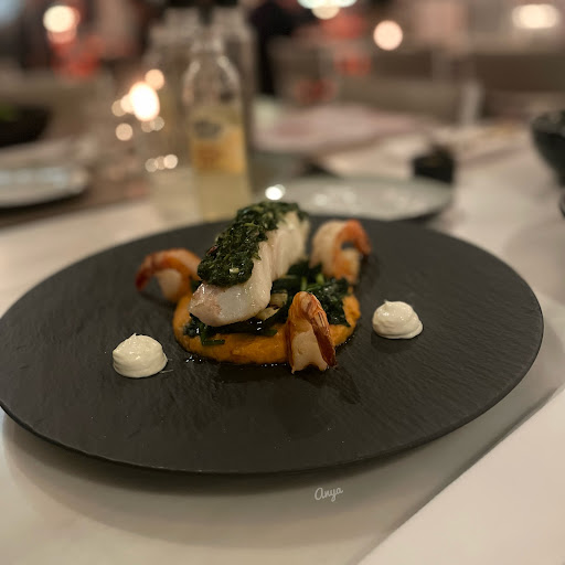 Cod fillet with Chimichurri (Cream of Potato and Smoked Pepper, Hangop, Vegetables and prawns) the cream and the fillet were super..