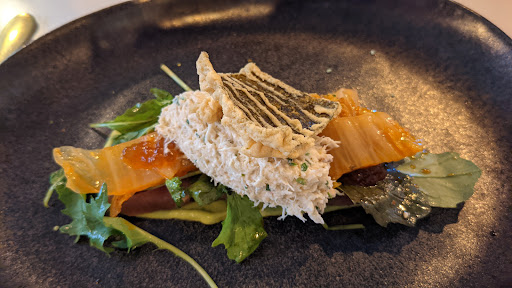 Langoustine Carpaccio and Crispy Chicken was a light appetizer and then a mix of chocolate form for desserts..