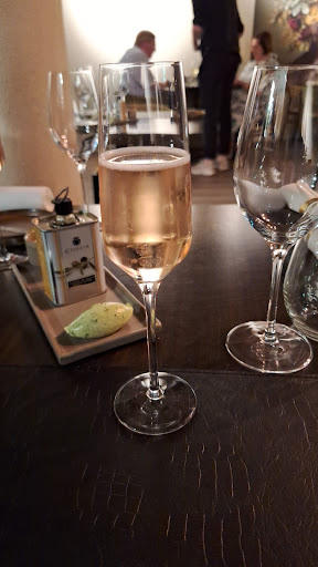Op tijd richting Venlo om de stad te verkennen en een kennismakingslunch. Een groot en gezellig winkelcentrum met verschillende oude gebouwen maakte onze wandeling zeker de moeite waard. Ons herkenningspunt was een smalle gevel met rood luifel en glas in lood ramen. We liepen binnen in de gezellig ingerichte lounge met bar waarachter de open keuken en sfeervol ingericht restaurant welke duidelijk groter was dan de gevel deed verwachten. Als aperitief de Maximum Brut Blanc de Blancs van Ferrari die uitstekend beviel. Waarbij een merengue van rode biet met plakje rode biet afgewerkt met een dotje bieslookcrème en een krokant nestje van Parmezaanse kaas met ansjoviscrème afgewerkt met een tomberry, erg lekker. Ernaast een heerlijke oester met kaviaar van bloedsinaasappel in een vinaigrette op basis van Jack Daniels. Een gelaagde smaakbeleving, prima.