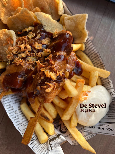 Aan de gevel van de friture prijkt een groot, lichtgevende reclamezuil waar een laars (‘stevel’ in het lokale dialect) op prijkt. We parkeren de auto langs de straat en besluiten deze friture te bezoeken. Bij binnenkomst zien we meteen dat er diverse zithoeken, om de frietjes te eten, zijn. Een hele gezellige indeling van de friture. Het pad in het midden leidt ons naar de snackvitrine alwaar wij onze bestelling kunnen plaatsen.