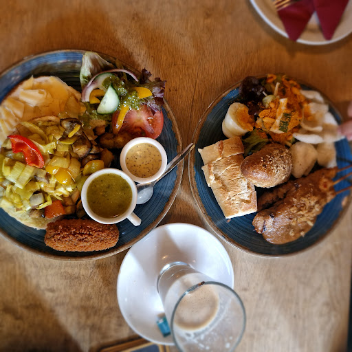 Read moreGezellig café met verrassend veel vegetarische en vegan gerechten op het menu. We liepen er toevallig langs en zagen op het bord buiten al wat vega(n) gerechten staan. Binnen een gezellig interieur en veel tafeltjes. Ondanks drukte konden we elkaar nog steeds goed verstaan. Op het menu bleek de keuze voor ons zelfs nog ruimer dan we dachten, we konden eens écht kiezen uit diverse vegan gerechten, van soep en sandwich tot hoofdgerechten (al was het nu lunchtijd dus konden we die nog niet bestellen). We hebben genoten van brood met vegetarische kroketten (vegan) en ons zoontje wilde een boterham met hagelslag. De prijs viel me ook mee, heel fijn dat er voor kleine kinderen ook een betaalbare optie te bestellen is. Dit is echt een plek waar je met iedereen (van carnivoor tot veganist) samen kunt eten, top! We gaan hier zeker nog eens heen als we weer eens in...