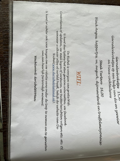Read moreSehr netter Service. Man kann nicht mit Kreditkarte bezahlen, ist wohl ziemlich verbreitet in den Niederlanden. ATM ist ein paar hundert Meter vom Restaurant in der Dorpstraat entfernt. Anpassungen an den Gerichten ist nicht möglich, was etwas irritierend war. Wir wollten die Sate Spiesse nur mit Sauce, ohne Salat , das ging irgendwie nicht… Als Vorspeise hatten wir Salat mit Ziegenkäse, der war lecker und frisch und Rindstartar. Das Fleisch hatte eine gute Qualität, war aber sehr grob geschnitten und sehnig; also man musste sich sehr viel Mühe beim Kauen geben. Zum Hauptgang hatten wir Steak medium gebraten und Seezunge. Dazu kamen ein kleiner Salat, Erbsensalat, Pommes und Mayo der Beilagensalat war leider mit einem Fertigsenfdressing angemacht, hat uns nicht geschmeckt. Der Erbsensalat war gut. Pommes etwas kalt aber kross. Die Seezunge war lecker und auch das Fleisch war geschmacklich gut, aber sehr zäh. Wir waren froh waren wir mal nicht in der Brasserie oder im Badhuis. Ist auf jeden Fall der kurze Spaziergang/Fahrradfahrt wert. Wird von Einhemischen und Stammgästen gut...