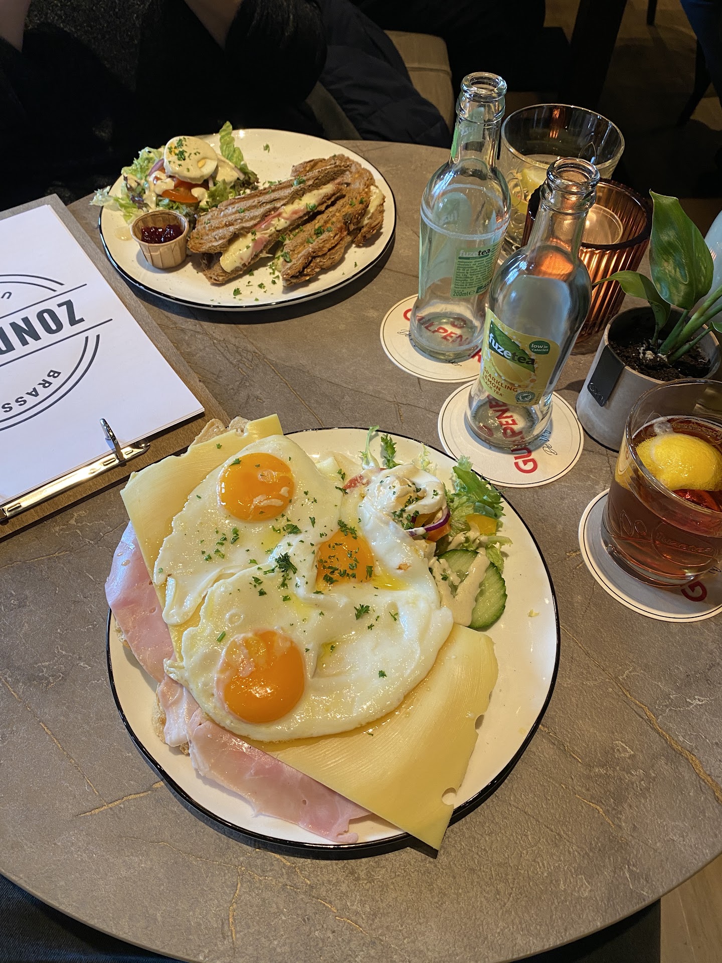Read moreTja in Ubachsberg kom je normaliter niet snel terecht. Maar dit dorpje in Zuid-Limburg ligt op de Mergelland route en aan de rand van het dorp is een wijnmaker gevestigd. Het terras van brasserie Zondheed was erg uitnodigend voor een bezoekje. Maar omdat het een beetje waaide, besloten we binnen de lunch te nuttigen. De brasserie ziet er zeer sfeervol uit, met een ( zo te zien bijna ) nieuw interieur. Prachtig design en stoelen met een perfecte zit. Wel ontdekten we dat er (nog) geen viltjes onder de stoelpoten zitten. De lunch was echt fantastisch. De clubsandwich "Zondeed" is een echte aanrader ; een etage van drie sneetjes bruin brood met gebakken spek, gebakken ei, tomaat, kaas, ham, komkommer, een lekker sausje en vergezeld van een prima salade. Prettige bediening, zeer vriendelijk en vlot geserveerd. Ook de cappuccino is verrukkelijk. Tja, nogmaals naar...