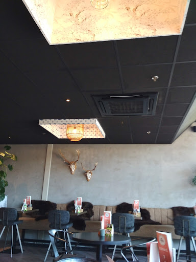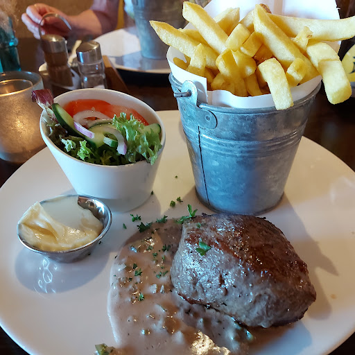 Na een namiddagje shoppen kwamen we uit op dit restaurant. Er was een dagpromotie op de steaks en aangezien mijn vriendin enorm graag steak eet zijn we daar op het achterterras iets gaan drinken en eten. Bediening was erg vriendelijk en snel, bakje water voor onze hond was absolute geen probleem. Eten kwam erg snel en was superlekker. Ikzelf eet niet zo graag steak omdat het meestal te taai is voor mij. Maar deze was perfect "medium" gebakken, lekker mals en heerlijk van smaak. De huisbereide frieten en groentjes pasten er perfect bij. De opmerking over de "te dure" huiswijn vind ik overdreven want dat was op de meeste plekken waar wij waren geweest (omgeving Rockanje) ook hetzelfde. Interieur was ook erg mooi, vooral de toiletten erg proper en leuk afgewerkt. Nodeloos te zeggen dat we volgende keer we nog eens in de buurt gaan winkelen er zeker...