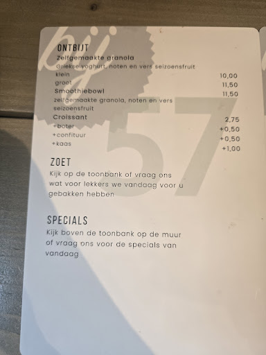 Read more..."Bij57 lunchroom"... Middenin het winkelrijke centrum van Voorschoten, prominent gelegen aan de "Schoolstraat 57", kun je prima toeven. Een leuk en warm ingerichte zaak, waar je je direct op je gemak voelt. Uiteraard wordt er een goede kop koffie of zoals je wilt "Coffee Special" geserveerd en daar horen natuurlijk ook "trendy" hapjes c.q. brood varianten bij. Denk "Bij57" aan een verrassende maar bescheiden kaart met een vegetarische touch met o.a. havermelk, groen, noten en meer, dus dat spreekt een specifieke groep mensen erg aan. Het enige wat ik bij het jonge team mis is een wat meer klantgerichter, ietwat vriendelijkere benadering... Zeker wel uw...