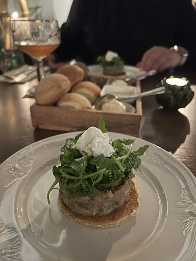 Als er een nieuw restaurant in je woonplaats is, is dat natuurlijk een goede reden om deze eens te proberen! Online gereserveerd en de betreffende avond zeer vriendelijk ontvangen door de dames van de bediening. Gezellig, klein restaurant maar bij binnenkomst viel al direct op dat het heel rumoerig was, ondanks dat er pas 3 tafels bezet waren. Wellicht komt dit door het ontbreken van gordijnen? Drankjes besteld, best wat bier keuze maar helaas geen alcoholvrije drankjes behalve de standaard frisjes. Vooraf hadden we de steak tartaar, persoonlijk proefde ik vooral de augurk en kappertjes, dit overheersde de vleessmaak, jammer! Als hoofdgerecht de bavette, deze was mooi rose gebakken en de bijgerechten & saus waren heerlijk. Maar het vlees zelf had veel zeem en stukken vet, en zonder steakmes is het dan best lastig eten. Dessert kaas was oke maar het wordt neergezet zonder uitleg, dat hoort toch niet. Bij navraag kon er ook behalve het noemen van wat namen geen uitleg gekregen worden.