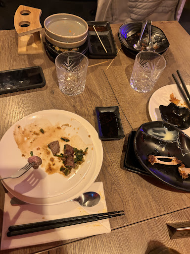 De kaart is uitgebreid en voor ieder moet er wel wat lekkers bij zitten. Flamed beef is prima. Spicy tori is redelijk spicy. De ossenhaas, wat flauw van smaak, niet altijd even mals, maar wat een belachelijke grote portie. Denk dat er meer dan een ons in de kom lag als het al geen anderhalve ons was. Niet handig als je dus juist meerdere gerechtJES vd kaart wil proberen. De yakitori spies zijn er gelijk 2 (why in hemelsnaam?) en bestaat uit grote kip brokken en weinig smaak e/o saus. De gefrituurde uienringen zijn errug zout.