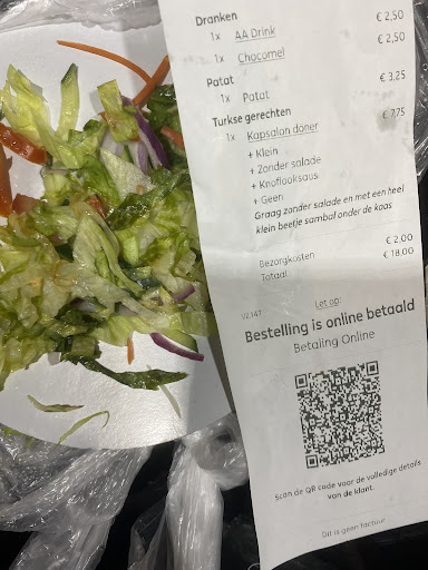 Read moreVandaag via thuisbezorgd besteld bij De Hoek en enorm positief verrast. We wilden het eten later hebben dan standaard, 20:15 uur, en het was er precies op de minuut. Het eten was warm, de friet nog kraakvers en alles was goed in verhouding. De kapsalon bevatte echt voldoende sla, vlees en friet, in een goede verhouding. De Turkse pizza met kip en salade was heerlijk warm en ook prima in balans. De friet, zoals gezegd, perfect gebakken. Zelfs na 10 minuten laten liggen en inmiddels dus wat was afgekoeld, was de friet niet 'soggy' maar gewoon nog erg lekker om te eten. Enige kleine puntjes: die frietjes zijn gekruid. Als je dit niet verwacht, kan het wellicht een dingetje zijn. Wij vonden deze kruiden, beetje paprikapoeder met zout (en wellicht nog meer) juist erg smakelijk en waren er blij mee verrast, maar, wat ik zei, als je friet met zout (of zonder) verwacht en dit niet lust, kan het wellicht een dingetje zijn. Wij bestellen in elk geval vrolijk de volgende keer weer hier! Als allerlaatste mijn complimenten voor de jongeman die het kwam brengen. Super vriendelijk...