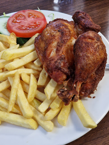 Ondanks de gefrituurde kip was het een lekkere halve kip, voldoende friet en een simpele salade.