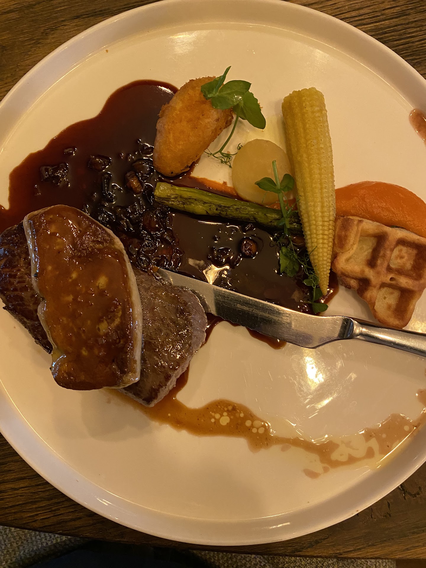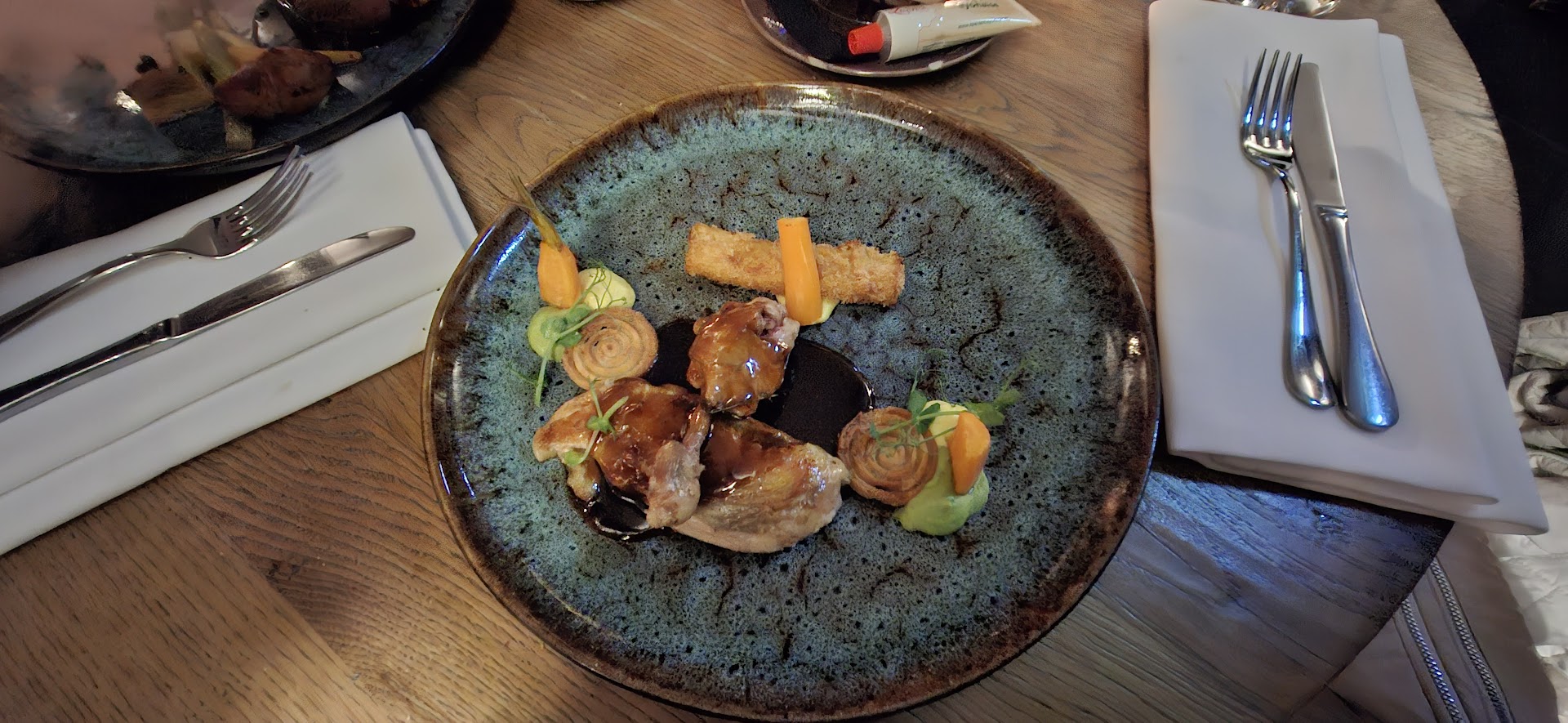 Started off with asking specialty of the house and was recommended a fish that I ordered in combination with a soup. They then had to tell me that they were out of the fish. Soup was absolutely cold when served but taste was ok. After the soup they asked us if we wanted to wait or if we would love to have the main dish right away. We opted for having it right away. Why they asked that is a miracle to me as we had to wait for over half an hour before finally served. Our beer was gone by then. Though we said we didn’t want anything to drink no more, we were asked two more times while waiting for our meal. Didn’t want another beer as there was absolutely no foam on top due to fatty glases. Duck was ok but served on the red side. If you decide to serve it that raw; please ask costumer how they like it. Wasn’t a great cut either so to cut it with a regular knife that I got was almost impossible. Obviously not what I had in mind...