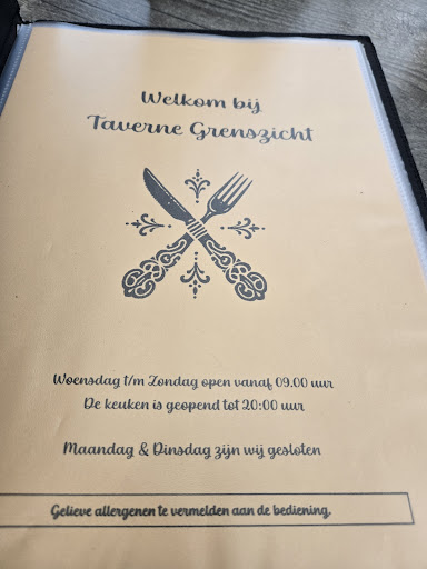 Vlak op de grens zit ook een eetgelegenheid, eveneens luisterend naar de naam Taverne en wel Taverne Grenszicht. Het is een eetcafé of cafetaria. Het is redelijk ruim en er is ook een fors terras, langs de weg, maar deels ook overdekt. Er zijn weer diverse schotels verkrijgbaar, weer mengeling van Nederlandse en Belgische invloeden. Maar allemaal lekker en niet duur. De bediening is vriendelijk en via de bel is het eten er snel. Tegenover de taverne is een groot parkeerterrein, dat is dus ook...