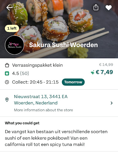 I bought a sushi box through Too Good To Go, advertised as being worth €15, and paid €7.50. I received only 12 pieces of very basic sushi, which didn’t feel worth even the €7.50 I paid — let alone the claimed €15 value. I was really disappointed. It felt misleading and not like a good deal at all. Wouldn’t recommend....