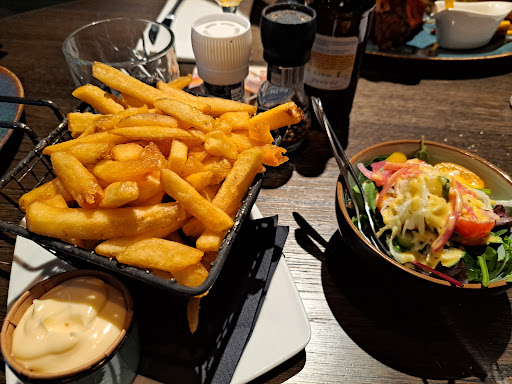 Omdat we een uitje in Maasbommel hadden leek het ons leuk om met zijn vieren te gaan eten in een restaurant als afsluiting. Dit restaurant hadden uitgezocht via de foto's en recensies van Google maps. Toen we aan kwamen lopen was het terras van het restaurant leeg terwijl 2 restaurants verder in de straat vol zaten. Dit zette ons aan het twijfelen, maar we hadden al gereserveerd dus we zijn gewoon naar binnen gegaan. Wij dachten dat het misschien kwam omdat het wat chiquer is, of achteraf omdat het nog een redelijk nieuw restaurant is, want met het restaurant zelf is niks mis. De carpaccio was goed van smaak. Ook de quiche was lekker. Het wordt geserveerd met lekker knapperige frietjes. De sparerib was wat aan de vette kant, maar de smaak was goed. We hebben uiteindelijk geen toetje genomen omdat we aardig vol zaten maar ook omdat er niet echt iets bij stond op de kaart wat eruit sprong. We kregen voor we gingen nog een Limoncello van het huis! Het personeel is heel erg netjes. Toen we weg gingen maakte (ik denk de eigenaar) een praatje. Dat vonden we wel leuk. Jammer dat hij dat niet eerder gedaan had, ik vind dat zelf altijd wel leuk tijdens het eten, dat het wat persoonlijker wordt. Al met al een prima restaurant dus. Als ik een minpuntje moet noemen dan is dat, dat er grote tv's aan de muur hangen. Opzich wel met een mooie foto, maar het hoort niet in een chique restaurant vind ik. Het leidt af.