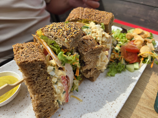Read moreMooi terras met volop zon (vrolijke rode kussens maken het een aantrekkelijker keus dan het buurterras). Het was druk - laatste mooie dag van het seizoen - dus je moest wel geduld hebben. Geen probleem: we waren een dagje uit. Personeel bestaat uit mensen 'met afstand tot de arbeidsmarkt', vriendelijk, bereidwillig, maar niet altijd even efficiënt (je zag ze vaak dwalen met een vol bord, zonder dat ze wisten wie het besteld had. Dus beter even zelf opletten en gebaren als je denkt dat dit jouw bestelling is). Eten was echt lekker. En de milkshake was...