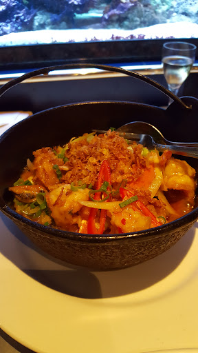 Smakelijk eten in een aantrekkelijke sfeer! Het grote restaurant is bijna leeg als we tegen 17:30 op een zondagmiddag met z’n drieën willen dineren. Echter vrij snel loopt dit kennelijk populaire restaurant vol en het (te) weinige personeel had het héél druk. Toch wat service betreft, hebben we niets te klagen – vooral de sprankelende, vaardige inzet van een jonge (niet-Chinese) ober viel op. Ik neem een soort Tjap-Tjoy met tofu – er stonden geen tofu-gerechten op de anders fraaie kaart, maar ik heb erom gevraagd; met witte rijst, €12,50. Een van de disgenoten neemt kip met kerriesaus (+ witte rijst) (€14) en de andere neemt mihoen met kip (€13,50). De porties worden prachtig gepresenteerd op eenvoudige doch functionele schalen, zijn afdoende qua hoeveelheid (ik zou ze beslist niet als ‘royaal’ gevuld noemen) en, ondanks ‘geen zout noch Ve-Tsin’, smaken prima. Hoewel we altijd terughoudend zijn in het drinken van koffie in een Chinees restaurant, valt de koffie hier bijzonder mee – een aanrader zelfs! Espresso à €2,30, cappuccino à €2,70. Het restaurant is uitzonderlijk zorgvuldig aangekleed in moderne Chinese stijl, en met een magnifiek aquarium in het midden. Toen we net aan tafel zaten, draaide een passende Chinese muziek heel zachtjes in de achtergrond. De wc’s zijn modern en even stijlvol ingericht. Jammer dat een gast bij de heren...