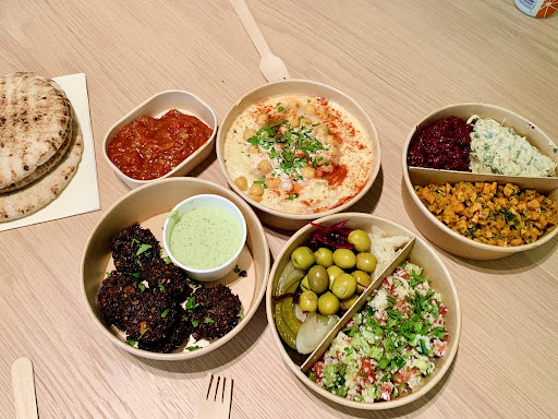 Small restaurant with three tables and a bar type seating. Open kitchen, young staff. We had the 'taste it all' for 17.50 pp. Nice diversity of middle eastern tastes. The hummus was soft and tasty. Falafels could be more for two person, but with good crunch. Bit too much mint for my taste. Salads were nice, enjoyed the beetroot salad most. The Baba ganoush was too smokey for me, thick and on the fatty end. Not my taste, but my partner liked it. Olives were not fresh, but pickled veggies had a good bite. For drinks you have a variety of non alcoholic options. Clients come to pick up their orders in the same room, which is a bit messy and gives the place not really a restaurant type of atmosphere. Best point is that...