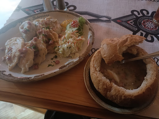 Read moreMiejsce ładne w środku . Przywita cie pięknie ubrana pani w góralskim stroju ! Ale niech cie to nie zmyli , jeżeli chodzi o jedzenie to nie mam pojęcia z kad tutaj tyle opinii -wnioskuje że większość nie była w górach i znaczna część osób nie umie gotować sama . Jedzenie było niestety nie smaczne . Razem z dziewczyna zamówiliśmy korytko składające się z 2x pieróg , 1 żeberko , 2x kotlet schabowy, 2x kiełbaska oraz golonka i do tego kwaśnica . Zaczynając od zupy nie jest to żadna kwaśnica ! Ktoś kto to serwuje pod taka nazwa nigdy nie jadł prawdziwej kwaśnicy , zupa lekko kwaśna , bardzo tłusta /napewno nie jest to kwaśnica-aczkolwiek smakowała z całego dania najlepiej . Pierogi- 2 duże pierogi z mięsem i kapustą /jestem facetem i potrafie gotować , ale te pierogi to przepaść.. ciasto grube gumowe . Podane w sposób jak by ktoś je podsmażył minutę z każdej strony i położył pod lampę/podgrzewacz do jedzenia co spowodowało były nie smaczne , były strasznie suche . Kiełbaski-z grila.. -informujcie klienta jeżeli na piekarnik mówicie gril.. bo jest to mega słaby cios jak dla mnie , kiełbaska z dobrej jakości mięsa , ale niestety podana tak jak pierogi - suche przeschnięte . Golonka- golonka okazała sie być pyszną ! I była sucha z wierzchu tak jak inne potrawy , ale z racji iż to tłuste mieso całościowo było okey . Schabowy - szału niema i nie wiem czy bym go określi pysznym . Napewno smacznym i zjadliwym - mało pieprzu jak dla mnie -za krótko w mleku o ile wgl był . Żeberka - niestety mięso przerośnięte /tłuste i nie zjadliwe.. sam znam z 3 przepisy które były by o niebo lepsze . A jeżeli decydujemy się na taki rodzaj mięsa , powinniśmy wziasc pod uwagę dobre przyprawy/przepis lub sosy aby smak mógł sie wyrównać przy słabszej jakości . Dodatki Buraczki/kapusta zasmażana/ogorek/surówka . Buraczki okey jak u mamy , ogorek kiszony przepyszny ! Surówka -okey Kapusta zasmażana-(Ala, skandal) nazwa przytoczona przezemnie . Nie wiem jak można podać tak wstrętna kapustę.. i skad wgl pomysł aby z kwaśnej kapusty zrobić słodkà nie wyobrażam sobie tak zmarnować tak dobra i ważna w górach przystawkę ! Kapusta przesłodzona , wstrętna . Obsługa - zero podzielności i bardzo słaba organizacja . Stoliki nie podzielone pod kelnera , przez co bardzo fajnie jest gdy podchodzi do ciebie już 4osoba po zamówienie zwłaszcza gdy jedziesz z ukochana na obiadów/kolacje i chciał byś fajnie spędzić czas we 2jkę . Temat wspominany wcześnej w komentarzach wiec najwidoczniej właściciel ma w dupie komentarze i uwagi klientów ;) Parking dostępny dla klientów kawałek dalej ! Wnętrze w środku zwykle proste drewniane -podobało mi się . Ogólnie nie polecę tej restauracji znajomym ponieważ jak dla mnie nie jest ona warta przejechania 120km w jedna strone i zjedzenia czegoś co tylko z nazwy mogło by przypominać góry /szkoda . Kucharz do zmiany.. Pozdrawiam i życze...