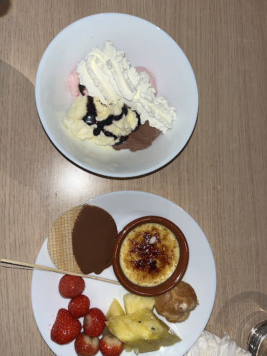 Gerechten die besteld werden kwamen snel door en deden kwa smaak niet onder van andere restaurants. Wel miste ik een aantal gerechten. Sommige gerechten werden opgediend op een gietijzeren plaatje met daaronder een plankje van rood hout. De rode verf was er bijna vanaf en het gegerecht kwam daardoor een beetje armoedig over. Maar de smaak was goed. De bediening die de lege schaaltjes en bordjes weg kwam halen, wisselende werkelijk géén woord. Niet: "heeft het gesmaakt" , niets! Het dessert buffet, waarvan op de website stond dat het 9 meter luxe buffet, veel keuze had, viel ontzettend tegen. Crème brûlée, waar geen Suiker laagje op at, verschrompelde diepvries tompoesjes, fruit waarvan de meloen keihard was en de ananas bruin. Het schepijs zag er beter uit, en volgens mijn kinderen was het lekker. Maar het softijs had kraak nog smaak. Nergens een bordje bij wat het voor moest stellen. Het buffet had met het aantal gerechtjes ingekort kunnen worden tot makkelijk 4 meter.