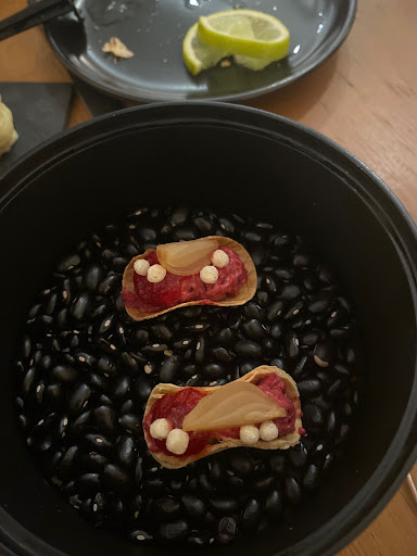Vervolgens werd het voorgerecht geserveerd: een verfijnde combinatie van vis en olijven, perfect op smaak gebracht. Hierna kregen we vers brood met roomboter, olijfolie en zeezout, een simpel maar elegant gerecht dat de pure smaken prachtig liet spreken.