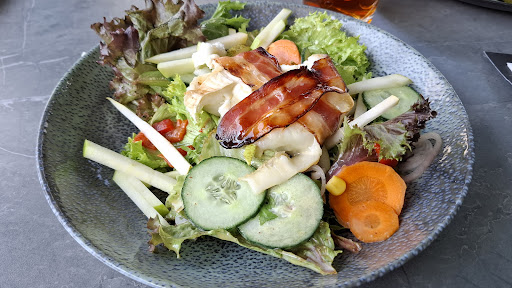 Salade geitenkaas (frisse salade, geitenkaas, spek, druiven, honing-mosterd dressing, peer, appel) De salade was proper gewassen en krulde lekker fris in de mond bij de eerste beet. De druiven waren wat ver te zoeken maar de appel en peer waren rijkelijk aanwezig. Het spek (2 lapjes) vond ik eerder te weinig voor zo een salade, dit mocht meer zijn en ook iets harder gebakken nog. De geitenkaas was perfect van cuison en ook nog warm toen het geleverd werd.