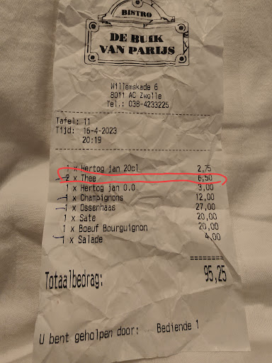 Read moreI ordered hot lemon water, it came up with a little cup of hot water with 2 thin slice of lemon in there, later on refilled with hot water again, and I was charged Euo 6.50 for it. Whilst my friend's beer was Euo 2.75, I feel being ripped off. On the bill, it says 2 * thee (tea), but there is no single leaf of tea in there, it's NOT tea. If a cup of lemon water is Euo 3.25, the refill was just hot water, with NOTHING else in there, the boss still charged me Euo 3.25 for a little hot water from kettle. I can't see anyone being so hungry for money, to rip off customer...