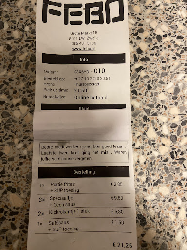 Eten vlakbij kan de kerk kan nog sneller dan naar de McDonald's gaan, want pal naast de kerk zit de Febo. Dat is een keten van snackbars, in Amsterdam ontstaan uit patatzaken met een automatiek. Het streven is wel naar goede kwaliteit, verse producten en vriendelijk personeel. Is dat niet het geval, dan hoort dat niet en is zeker niet de policy van de Febo. Het ligt aan de bedrijfsleiding ter plekke en helpt dat niet dan de klacht naar het hoofdkantoor. Bij de Febo kan je voordelig terecht voor een snelle hap. Snel is mogelijk omdat de Febo al die jaren de automatiek behouden heeft. Anders dan zijn Rotterdamse tegenhanger Bram Ladage. Beiden serveren echter allemaal verse waar, ter plekke klaargemaakt en gefrituurd in verse en schone frituurolie. Febo, opgericht in 1941 onder de naam Bakkerij FEBO en later herdoopt tot Maison FEBO, is het bedrijf van banketbakker Johan Izaäk de Borst. Naast ambachtelijk brood en andere lekkernijen verdiepte Johan de Borst zich in het maken van een snack: de kroket. De vraag naar zijn vers gemaakte kroket was zo groot dat hij in 1960 stopte met de banketbakkerij en verder ging met een automatiek waar hij kroketten en andere verse snacks verkocht. De automatiek is er nog overal, ook in hier in Zwolle. Maar het is hier niet alleen een snackkraam, alleen een loket, het is een vestiging met diverse tafels en stoeltjes en ook een terras zodat je de frites en snacks (bij mooi weer uiteraard) ter plaatse kan opeten. Het eten is ondanks dat het toch het predikaat snackbar heeft echt erg lekker, door de versheid en de speciale bereiding. Daar staat de Febo en ook Bram Ladage om bekend. Als u geen goede kwaliteit krijgt, direct klagen want...