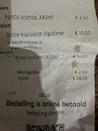 Read moreOp maandag 26ste een Pizza en een kapsalon besteld voor 18:00. Om 17:50 een belletje dat het wat later werd.... Er was een bezorger niet komen opdagen #begripvoorennetjesdatjebelt. Uiteindelijk de pizza en kapsalon om 18:40 gekregen. Pizza was koud en bodem was zeer taai. Volgens mij heeft de pizza net zo lang op mij moeten wachten als ik op hem, namelijk de volle 40 minuten extra! Onbegrijpelijk dat je het lef hebt om zo'n pizza nog een klant voor te schotelen!!!!