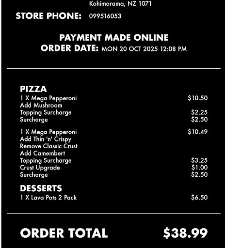 Today was a unhappy experience with Domino's @ Saint Heliers via internet order and phone follow up. I had unexpected visitors and ordered two Mega Pepperoni large thin crust Pizza's one with extra Camembert and one with extra mushrooms. I also ordered Lava Pots 2 pack. The store lady phone me back to inform me that they had no Lava Pots to which I replied ok, just refund me. She then offered they could instead give me Lava Cake, if that was ok? I agreed. ** The ordered arrived in time delivered by an Ueber driver who I went outside to meet for ease of delivery. When he gave me the order he was on the phone to someone in his own language chatting over loudspeaker and very little interest in me as the customer. I checked the order and notice that there was only 1 Lava Cake but the Store Lady had told me she would replace the ordered and paid Lava Pots 2 pack (intended for my visitors kids) with Lava Cake. I informed the driver who told me short and abrupt- this is what I got given, that is what it is. He drove off.