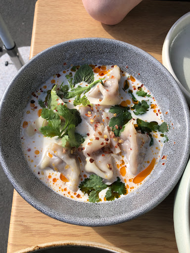 There are three choices of dumplings on the menu. We would have preferred the prawn and chicken but the menu indicated that they come in a broth. We didn’t want broth, just dumplings, so went with the lamb and mushroom. And we had assumed they would come out first or, at the least, together with the tacos. Regardless, we were not asked our preference. Not only did the tacos come first but we were on our last bites of our third taco, and on the verge of cancelling the dumplings, when to our great surprise the dumplings showed up, sitting in a full bowl of creamy white soup.