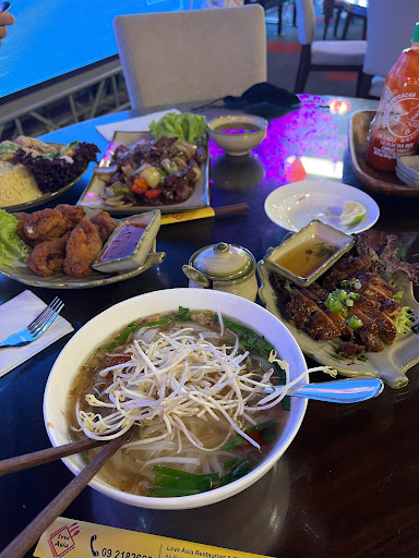 Read moreThe restaurant is quite big with two large private rooms on either side of the main dining area. The main dining area is very colourful with lanterns and wall decoration. There is also a huge TV on one of the wall. What first got my attention after entering was the dessert cabinet. After getting to our table, we looked through the large menu. They have quite a lot of different food available. To me, it looked like it was primarily Vietnamese with some Thai and Malaysian influenced dishes. Ordering was fairly easy as you just write down the dish that you want on a piece of paper and hand it off to the staff. We ordered one of the platters and a couple of main dishes to share. We ordered one of the caramelised pork belly with sticky rice and I really enjoyed it. The sticky rice had a really nice texture and the pork belly had the flavours of shrimp paste which I really enjoy. The grilled lemongrass chicken noodle soup was also quite tasty. The chicken wasn't dry and the soup had a nice flavour with the pork rinds. We also tried their beef rendang with roti. It unsurprisingly isn't proper rendang, it was more like a coconut beef stew. I enjoyed the flavour of the rendang and liked the crispness of the roti. We also got the Special Love Asia platter. The platter had a variety of different meat like the beef in betel leaves or the spring roll, as well as the herbs and lettuce and the vermicelli. It also came with rice paper so you can roll it all up to make a fresh rice roll with your filling of choice. We also had some dessert. The fried ice cream is what you expect and you can choose the flavour of the ice cream inside. They didn't have the salted egg sponge cake which I wanted to try so ended up with the cashew cake which was more moussy than nutty. The place has surprising tasty food. I think it was the novelty of the DIY rice rolls which made me really enjoy the meal. There was also quite a lot of parking but it was full when we went so we had to park on the road. The place itself wasn't too difficult to find, just keep an eye out for the lights. Edit: The vege fried rice was nice but a bit bland. The satay roti had a nice sauce but the roti was a bit...