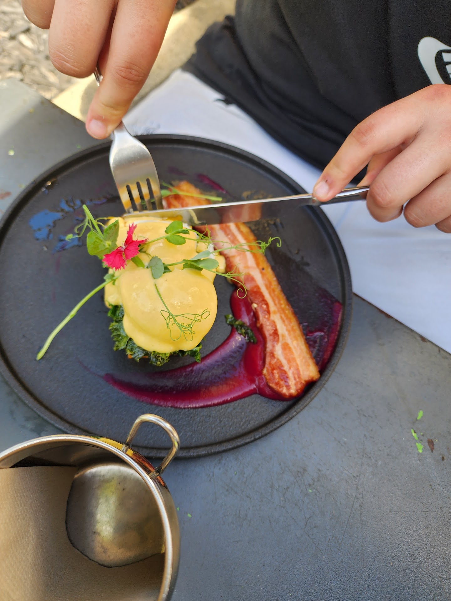Amazing service and quick food delivery. The eggs bene looked beautiful but my son didn't like the kale or the thicker bacon rashers. I think those are more personal reasons as the food was still tasty.