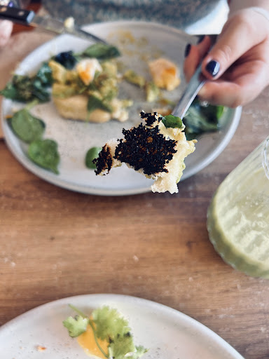 The atmosphere is fun bright and vibrant, with people laughing and birds twittering. Unfortunately there were also literally a dozen flies above the bar/in the dining room which was off-putting when I noticed and subsequently counted. The bloody Maria I ordered (bloody Mary with tequila) came out quickly and was not nearly as spiced as I would have enjoyed, tasting overwhelmingly of simple tomatoes even after a vigorously stirring. I enjoyed it non the less but certainly would have enjoyed it more with more hot sauce or worcestershire.