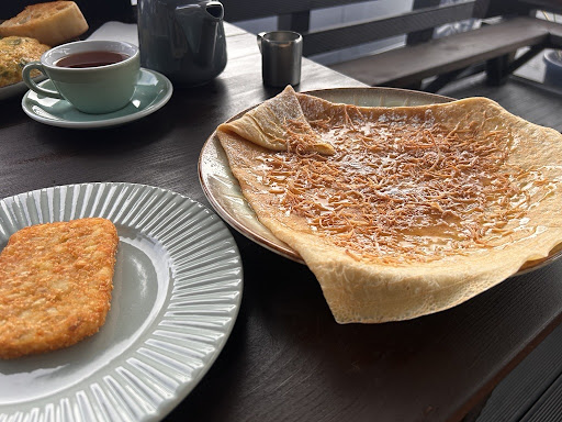 This was the highlight meal of my trip. I had been hankering for crepes since before I arrived! A few earlier attempts at scratching this itch had been underwhelming (and what is it with banoffee crepes in NZ!). This little cafe is in a beautiful suburban area of Auckland not too far away from so descent sized green spaces. And doggo friendly (back deck area). There are both inside and outside seating options. We choose outside which is at the rear and sheltered by plastic screens. Crepe options here are truly drool worthy. Of course, my heart was set on one without Nutella but really liked the toasted coconut idea... no problem at all ... homemade caramel and toasted coconut crepe coming up! And it was delish! My cousin had the egg dish option and also agreed this was the best breakfast of the 2-week trip (perfectly made, generous and tasty!). I also ordered a hashbrown as we were curious as to the difference between hashbrown and hash cake ... see photos. Both perfectly golden and yum. I will definitely be seeking this cafe out...