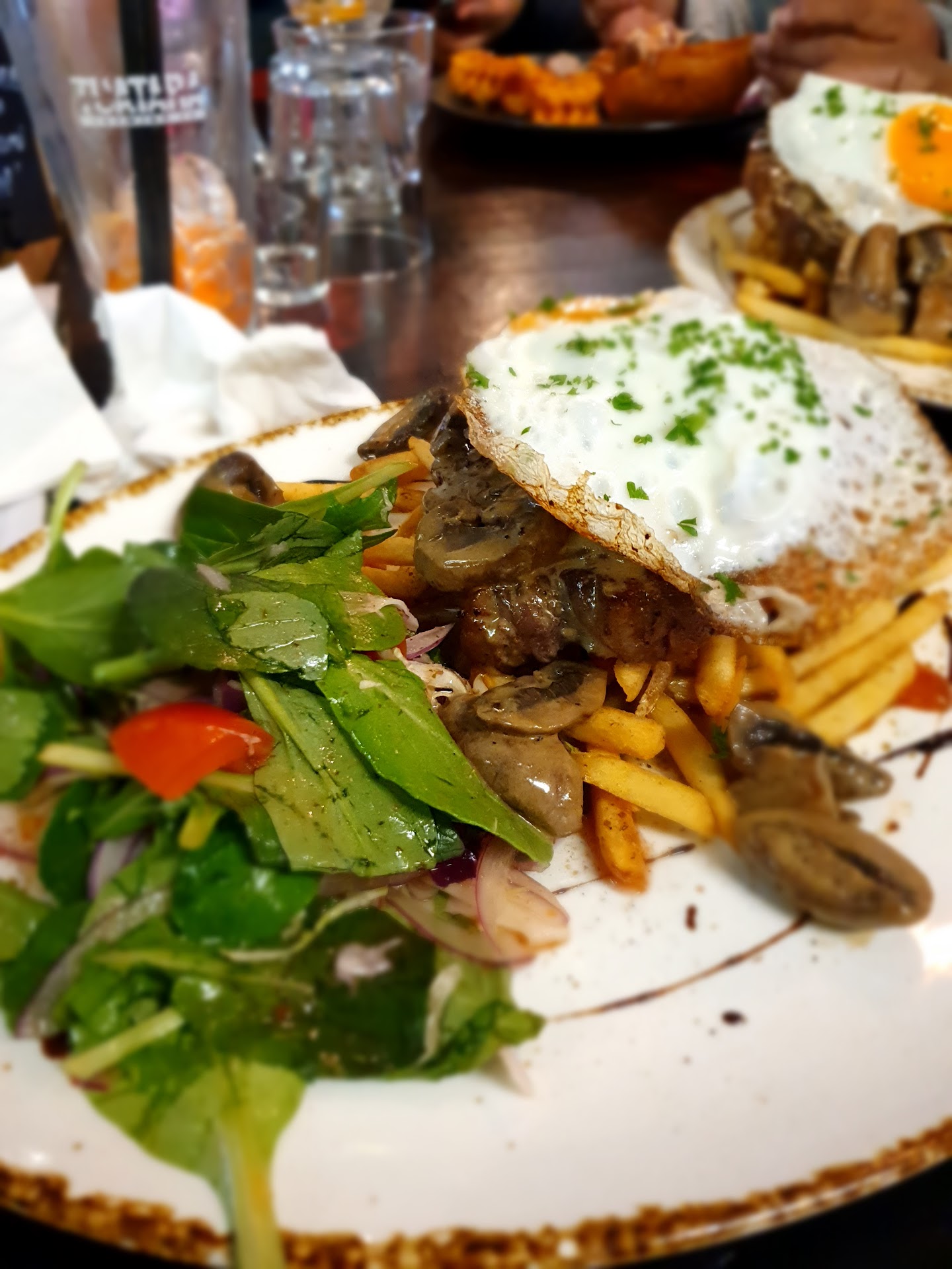 Repeat steak finally came… and I had to ask for cutlery again… and I wasn’t given a steak knife for my now accurately cooked steak. So instead of cutting nicely, I had to kinda rip n tear with a regular dull knife. We soldier on. The 2nd steak was good.