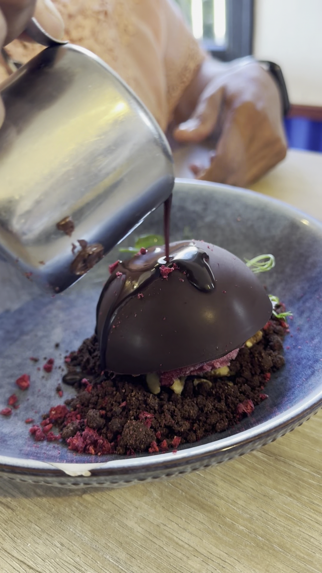 Chocolate Bomb: A showstopper dessert. Watching the hot chocolate melt the dome was like a scene from Alice in Wonderland. The combination of chocolate soil, berry sorbet, and other elements was magical.