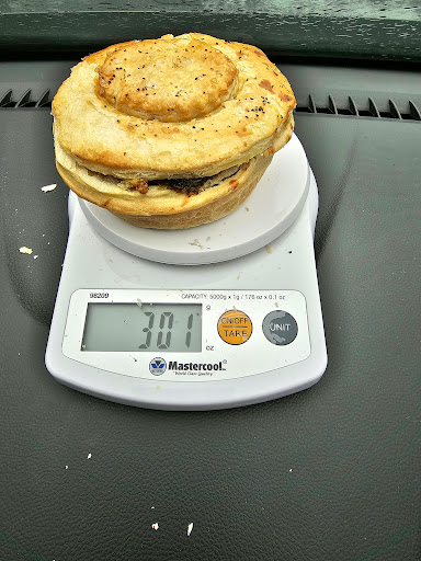 Read moreThere was great range of pies written up on the board so I selected the steak, chilli cheese. Turns out this is discontinued and had been replaced with Smoky Brisket, Jalapeno and cheese for I think $NZ8. So I went with that. Rain had set in for the day so I was forced into the car where I sat the pie on the scales on the car seat. It weighed in at 297gms. The biggest pie so far. I thought it may have something to do with the soft seat so with the pie poised on the top of the scales, I attempted to transport it to the hard, level dash. It turns out that my scales are quite slippery. The pie slid off hit the center consul, bounce off my leg, bounced off the brake pedal and landed on the plastic mat. I really struggled to retrieve it time but fortunately made within the 15 second rule. (It is 15 seconds isn’t it?) So the picture here is after its tumble and as you can see, it held together pretty well. You can also see that it cracked the 300gram benchmark. In fact, I found the pastry to be a little bit too think in places. Still to the quality standard of your average Kiwi bakery though. The filling was excellent. Just the right amount of smoky, beef, cheese and jalapenos. It was a very tasty pie and I think would rate with most pie aficionados. 9.5/10 I had a sausage roll as well but it was nothing special. It did taste a little funny. (Might have had some...