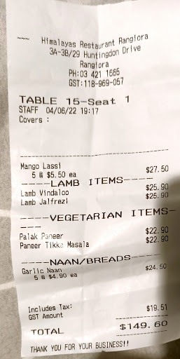 Read moreHimalayas is one of our go to's in Rangiora and the food is authentic Indian, without the flavours all being same same as you find in other Indian restaurants. We went on Saturday night 5/10/24 and as usual the food was great however the service was very poor. We got an obviously new waitress who tried hard by was belittled by her fellow waiter, an older male Caucasian. She was too young to serve drinks and it took 20 minutes for him to pour our drinks for her to serve the first time and 15 minutes the second time. This was woeful as there were only 15 people in the restaurant including us!!! He either fawned over the 2 tables he was serving, mucked around with the till or spent time in the kitchen instead of watching and being attentive to the whole front of house. We felt sorry for the young waitress as when ever she asked a question she was told off or belittled. It certainly took the pleasure out of the evening and if he was serving next time we'd go...