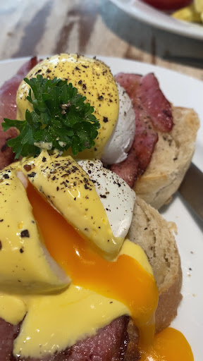 Our brunch came out and it looked as amazing as it tasted. The ciabatta was toasted to perfection, the yolks were runny, the hollandaise was so tasty and the bacon was just how I liked it!! The hash browns were hot and crisp.