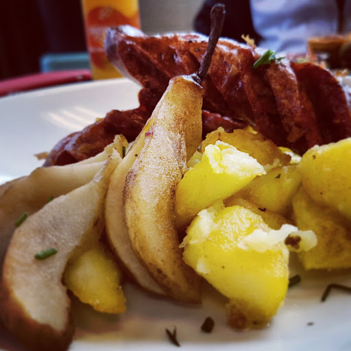 Being a treat brunch, we cut loose and ordered lots from the selection. From the cabinet a Bacon & Vegetable Langos; a herby pork sausage roll, and a couple of miniature mince and cheese pies. While from the kitchen we couldn’t resist the Wholewheat pancakes with berries & coconut yogurt, and a plate of the Chorizo, Poached Pears & Fried Potatoes. All topped off with a decent flat white coffee and a Berries n Cream smoothie.