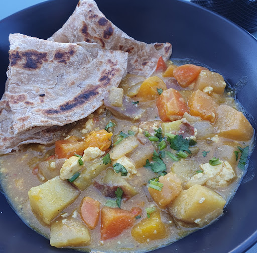 Today I tried their Tofu & Winter Vegetable Curry $10 lunch special, with was served hot with 2 flakey Wholemeal Roti flat breads on the side. It was sweet, savoury & warmly spiced. The Vegetables were Sweet potato, Pumpkin, Red & Yellow Peppers, Carrots, Onions, Celery with Crumbled Tofu, Cilantro in a light mild to medium spiced coconut curry gravy. Delicious & not heavy, which meant I could continue to work the afternoon away without a carb crash. Great value!...