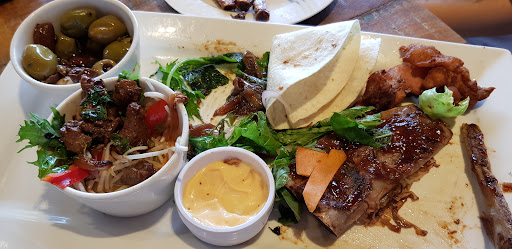 Next, the food arrived. Immediately, couldn't help but feel even more disappointed by looking at the size of the platter and the portion on it. It was way too little to be called a platter for two. Two children maybe. I thought to myself, at least if the food tasted good, I won't feel so bad about paying $39 for such small amount of food, but no, the food was terrible to say the least. The only thing that they made that was mediocre at the most wad the pork ribs. The seared steak they call it was nothing but fully cooked cheap beef pieces which were so dry and salty, it was like very tough jerky that has been dunked in very salty soy sauce for weeks. The fried chicken pieces were very crispy on the outside but the meat was also very dry and overcooked, which tasted like deep fried sawdust that had gone bad. Tortilla that came with it was also very dry and stale. Greens were good but looked lifeless. And what was the point of bowlful of olives, only item which they gave generous amount of? So we can order more drinks to wash down disgust and salty foods?