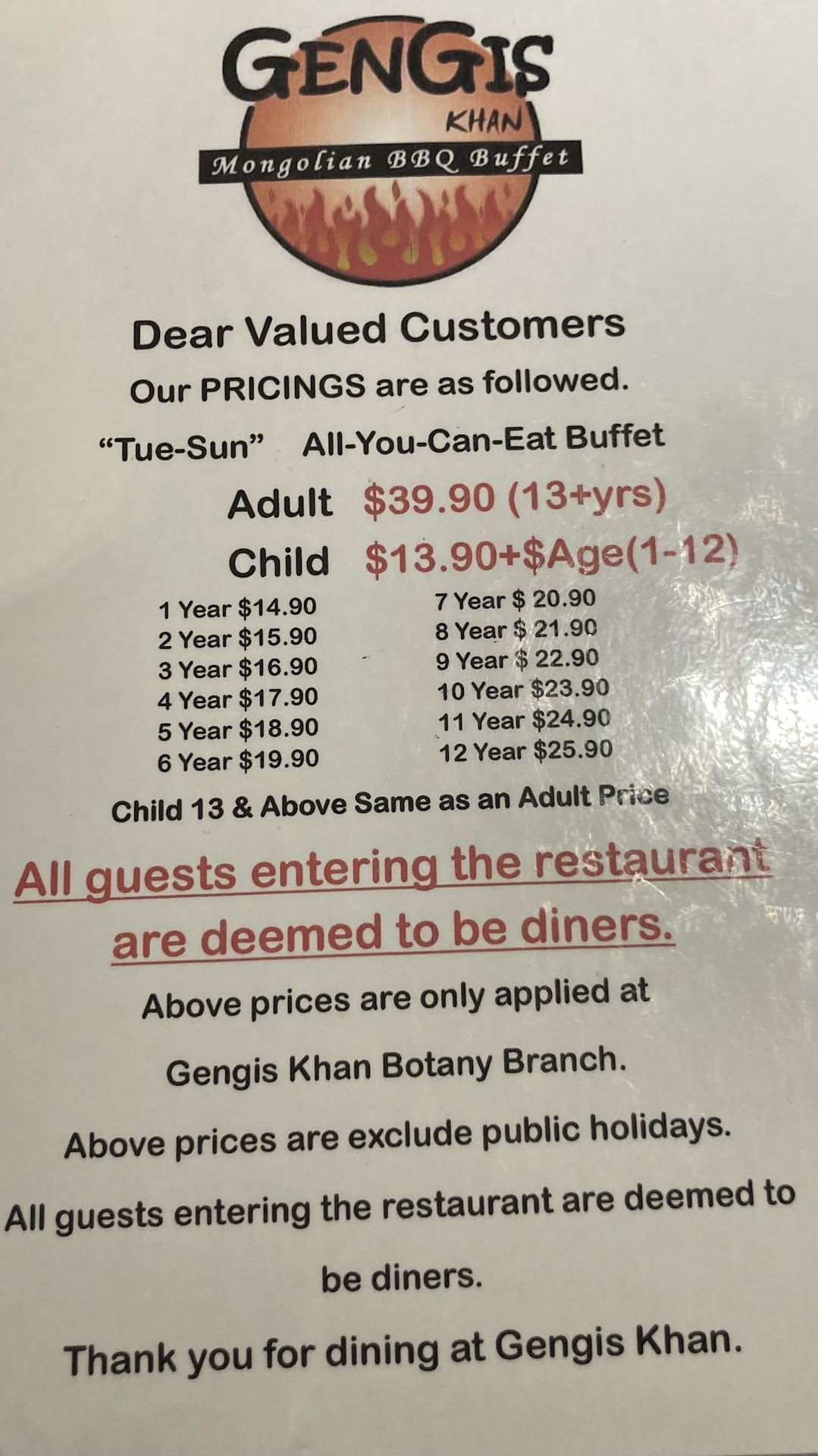 Ti Rakau Genghis Khan busy night organised and sizeable venue. Catering buffet of salads seafood fried and cooked buffets. Than a selection of meats and salads with condiment sauces to be viewed as you onlookers 3 -4 chefs entertaining spatula and knives grills with your stir fry as it is tossed and plated to you. Hindrance is the line lanes as there can be a confusion to the buffet lines causing you to file in the wrong queue and ending in the back of the queue can be an annoyance to your service. But patiently waiting you enjoy the meal with your guest unless you are in the dessert line and people are jumping queues to be in with there group so as to not wait in the long queue that is now overlapping the buffet lines while you wait 45 minutes later the cattle jumpers get ahead with x2 pancakes per customer you wait or do what my husband did ( unwise go 4 times and still cattle jumpers and he gives up with no dessert) but you persist in the line on next visit and wait alongside and get the same so you don't have to wait again. Urgently need a realignment of lanes suggestions is to maybe reposition two pancake grilles opposite either side one near coffee and tea area and guest tables width rather than length so lanes have readable access. Plenty of space it's a realignment of positioning areas would make more rather than less and happy all round. Wait services very good at tables and buffet collecting and tidily organised well done. Not all the Ghengis Khan restaurants are the same so you have to bear this in mind. Paying bill and time allocated can be rushed an imposed on you to hurry up an move out for the next service maybe looking at a 30min gap rather than hustling customers out like a herd of cattle. We know the service, meals, are great but let's have the whole experience right up to the end when you make payment remember it's customers money that pays for repeat of business is that not important "great overall experience " I believe it should be don't you? Catering for 35 people @ $ 22.95 is for one being but you could see brings of up to 60 people what a sizeable amount and that does not include the side drinks so you would envisage customer service flowing through until you leave, I would like to imagine that to be the case but at times its not. Ghengis Khan I would come back but do take into account suggestion there would be so much growth if there were amendments to the line locations and pancake areas. However thankyou for the meal and wait services. I did not take photos last Saturday but full house and more queues coming and going. Note a single door opening is hard to get in and out and which prams are coming and going it's a traffic jam so help bring in more customers by looking at ways to increase rather than minimise. It's like the obstruction is to ward of people who try to take off and nor pay but there is always a better solution to ensuring payment is made weather as they enter in first or ensuring the guest party organiser collect payments of there guest and make payment once all have sorted before eating as suggestions there are always a more improved ways of ensuring everyone is having a great night or day and that includes the restaurant employees and team. Again great selections of buffets and...