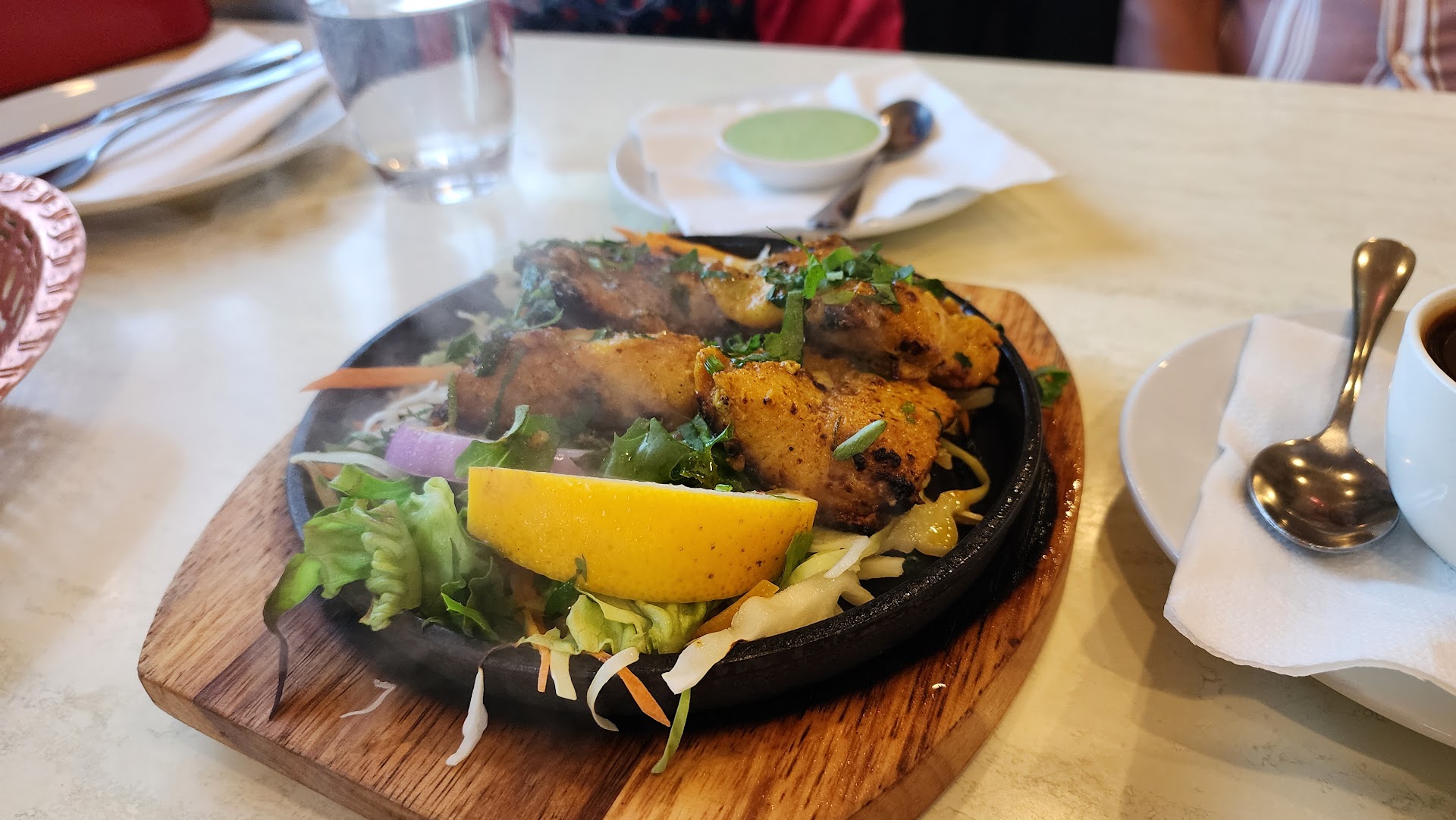 We were met by someone opening the door for us and gave a the most amazing welcome....much like you'd welcome guests you anxiously expecting. As soon as we were seated a lovely lady poured us a glass of water with the warmest most sincere smile. The place was pumping. We asked the water waitress what her favorite thing to eat is ... In her broken English she pointed at something on the menu and slipped away to promptly attend to someone else . When our waiter came we asked him what it couldn't have been she was suggesting.... He said he wasn't sure but suggested the butter chicken and a goat curry .