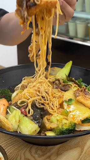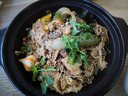 We came by for lunch to try it out since it was new. We weren't too sure of how it worked but there was a menu behind the counter which was a good start. They also have actual menus that you can take to a table but you order from the counter. There were quite a few options, either order from the menu, order the prepared side dishes from beside the counter or select items from the fridge and then they cook it for you. They also had a bubble tea area on the side. We went the with menu items but the selectable food looked interesting. It looked like you pick what you wanted and decide how to cook it all based on the weight of the items you had picked. We grabbed a noodle dish each and dumplings and filled pancakes to share. I had the noodles with pork and vegetables in a thick gravy. I thought it was quite bland. There were condiments on the table to spice it up. The dumplings were nice but quite small, easily bite-sized. I quite liked the beef stuffed pancake, crispy and full of flavour. The taro pearl milk tea was alright but the pearls were almost overcooked and too soft. It was quite an interesting and cheap...