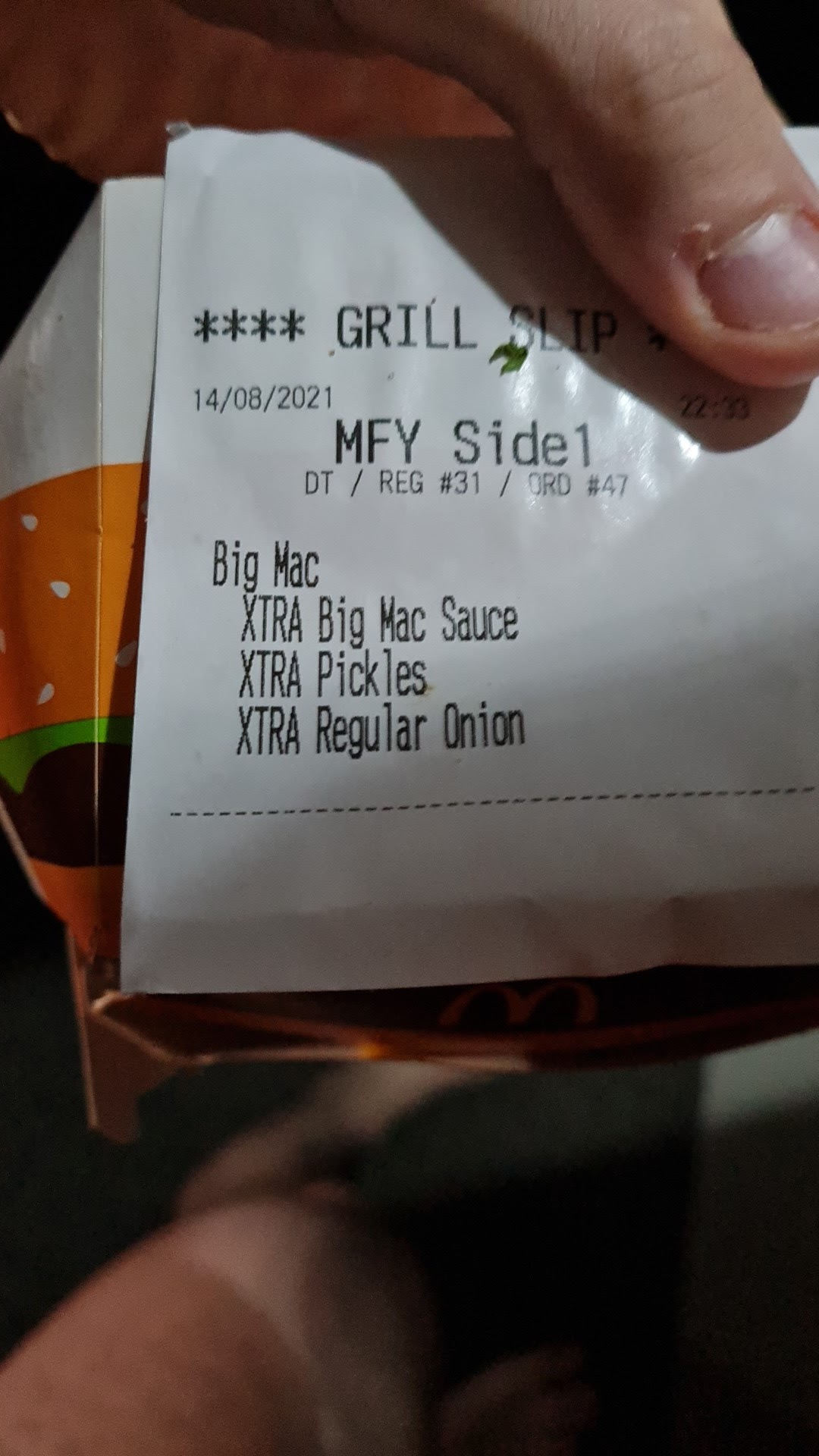 After ordering a big Mac hunger buster with extra pickles, onion, and Mac sauce on both the burgers.